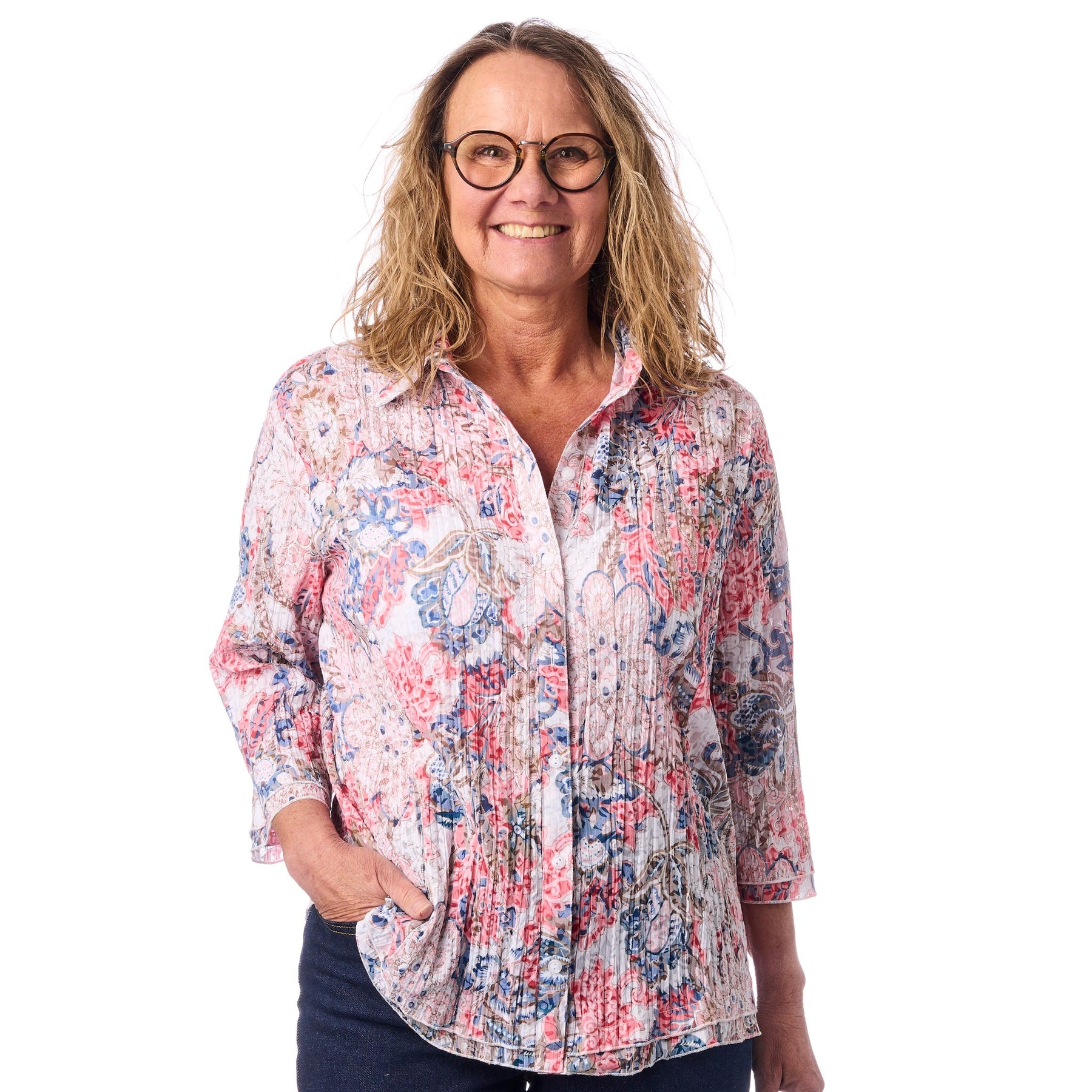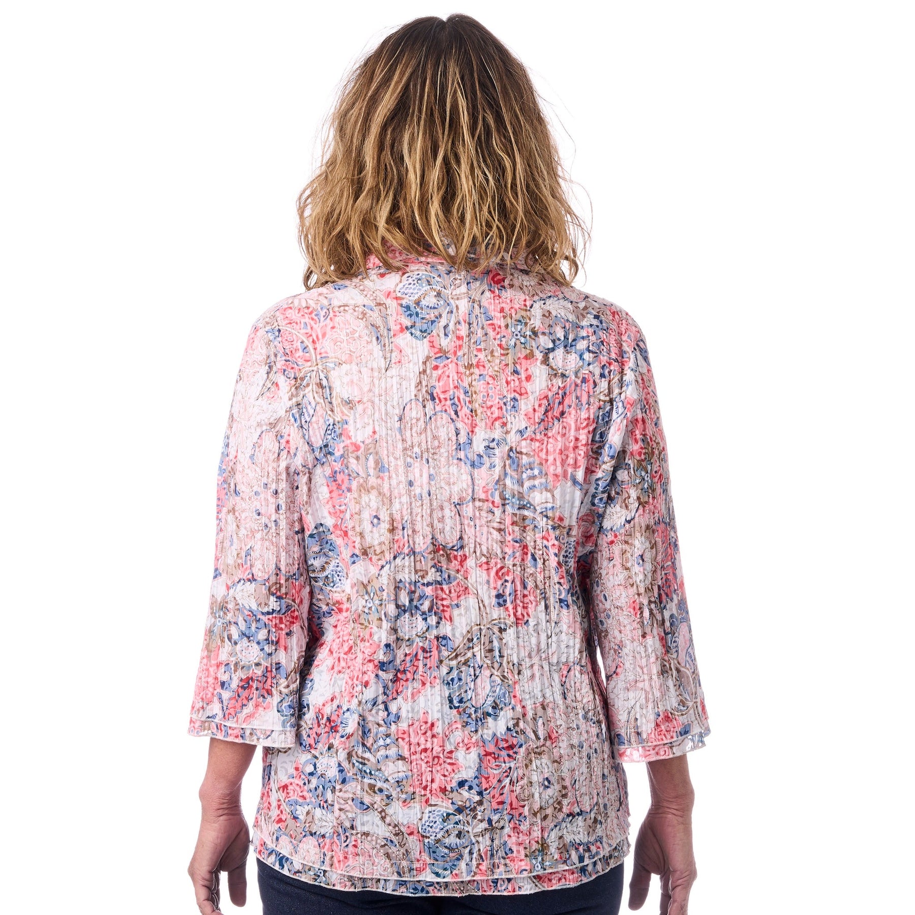 • Rikt blomtryck med paisleydetaljer i korallröd, blå och olivgrön — ett snyggt statement-plagg.