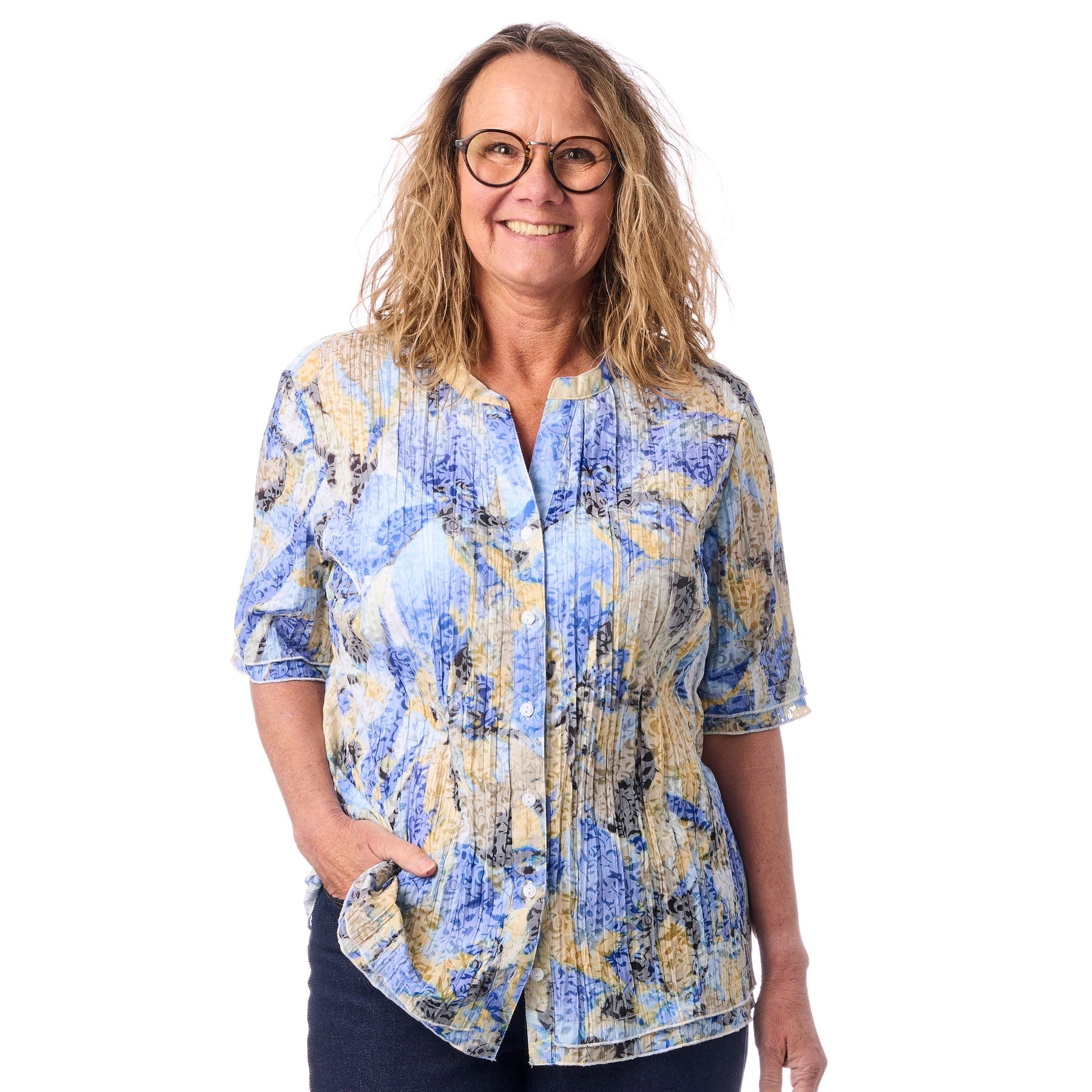 Tyget har en vacker, permanent krinklad struktur som ger skjortan ett avslappnat och levende uttryck. Det bästa? Den krinklade ytan gör att du aldrig behöver stryka den. Ta ut den ur tvättmaskinen, häng upp den på tork — och den är klar. Perfekt för resan när strykjärnet stannar hemma.