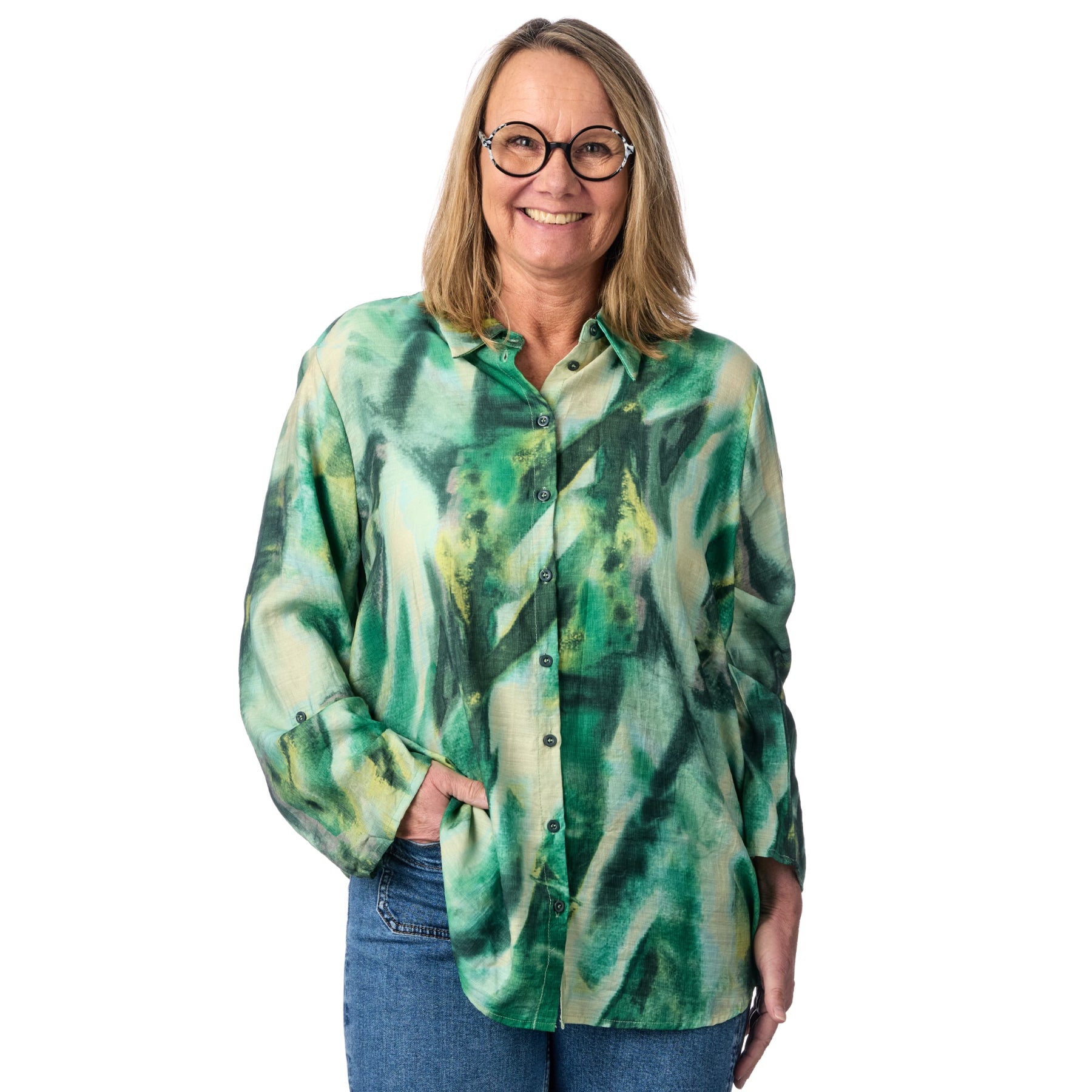 Skjortan är lite längre baktill än framtill. Det gör att den faller snyggt, ger lite extra täckning bak – och gör den perfekt att styla med både byxor och leggings.