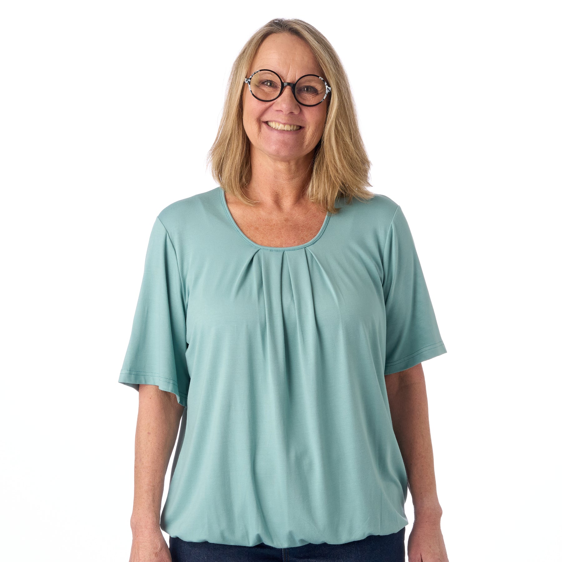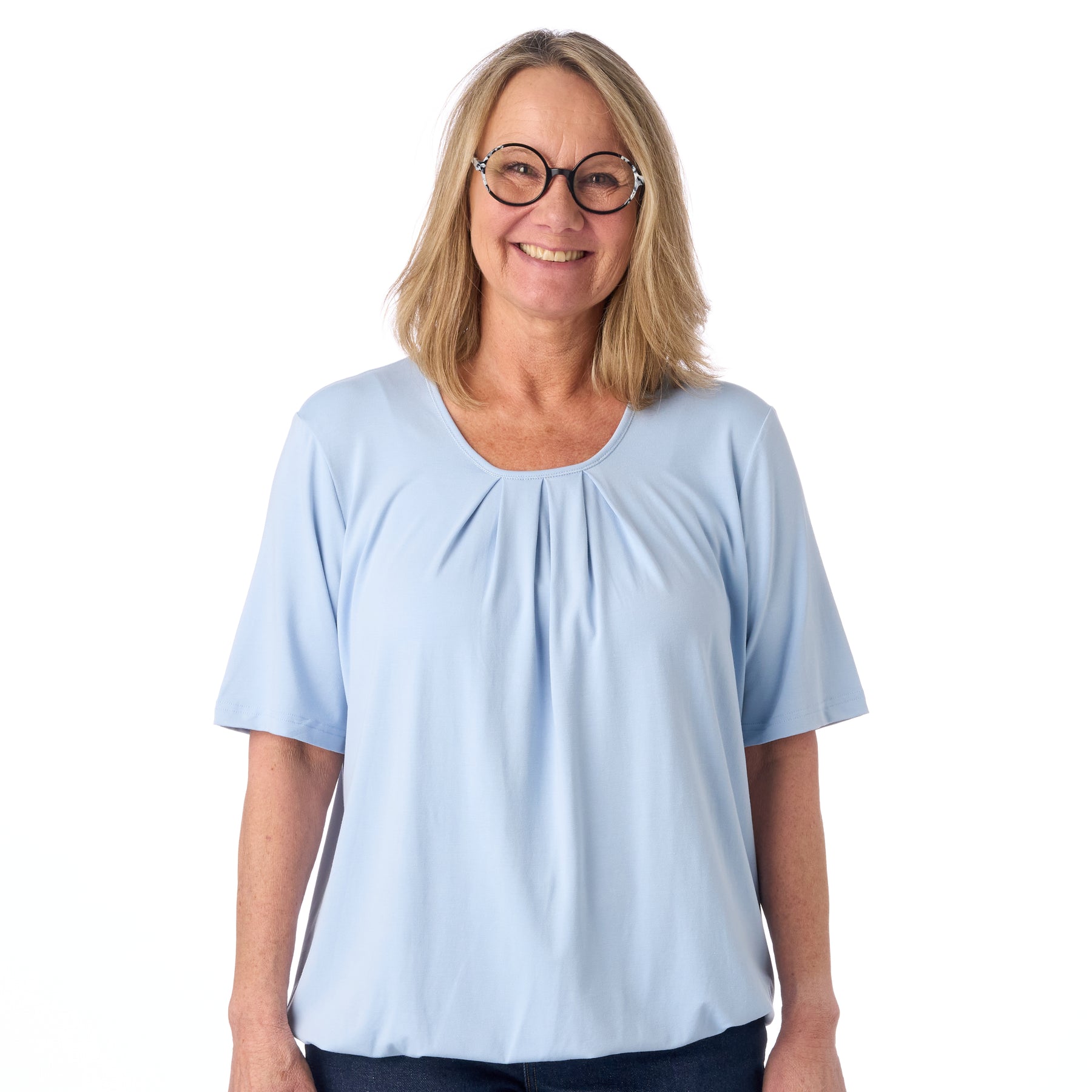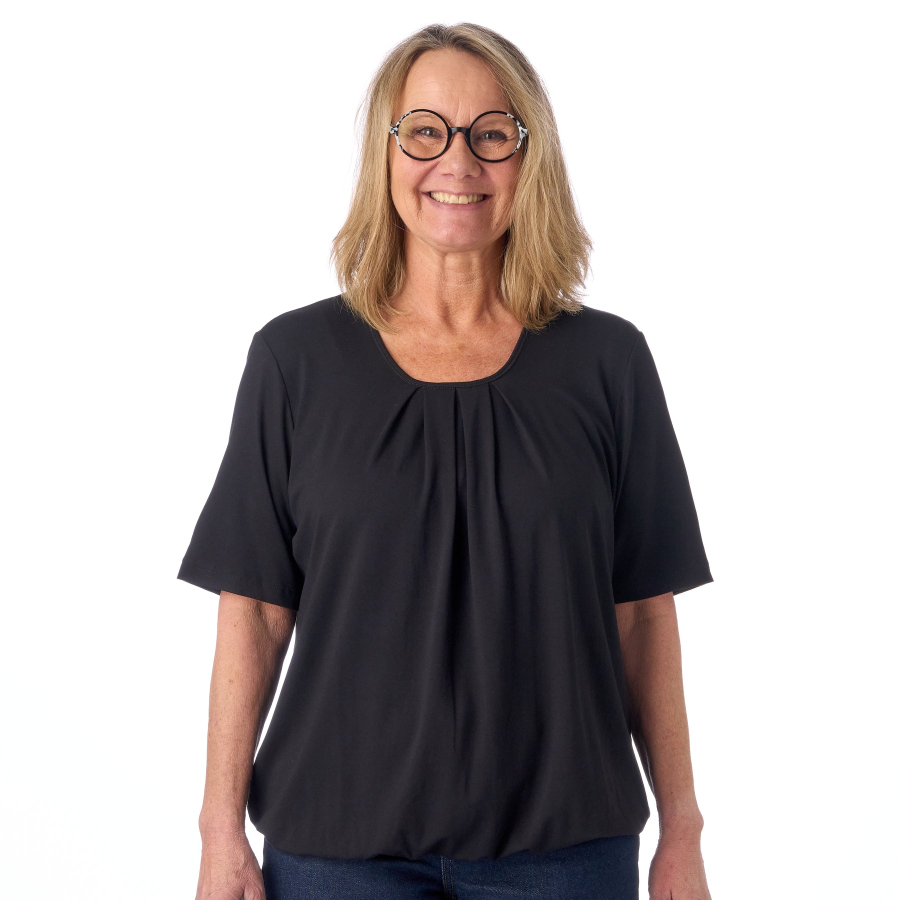 Vi har medvetet designat de korta ärmarna på blusen lite längre än det man kanske är van vid. Det gör att ärmarna inte kryper upp och kommer i vägen när du tar på dig en jacka eller tröja.