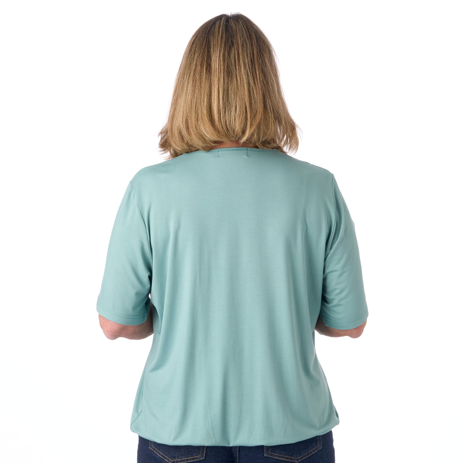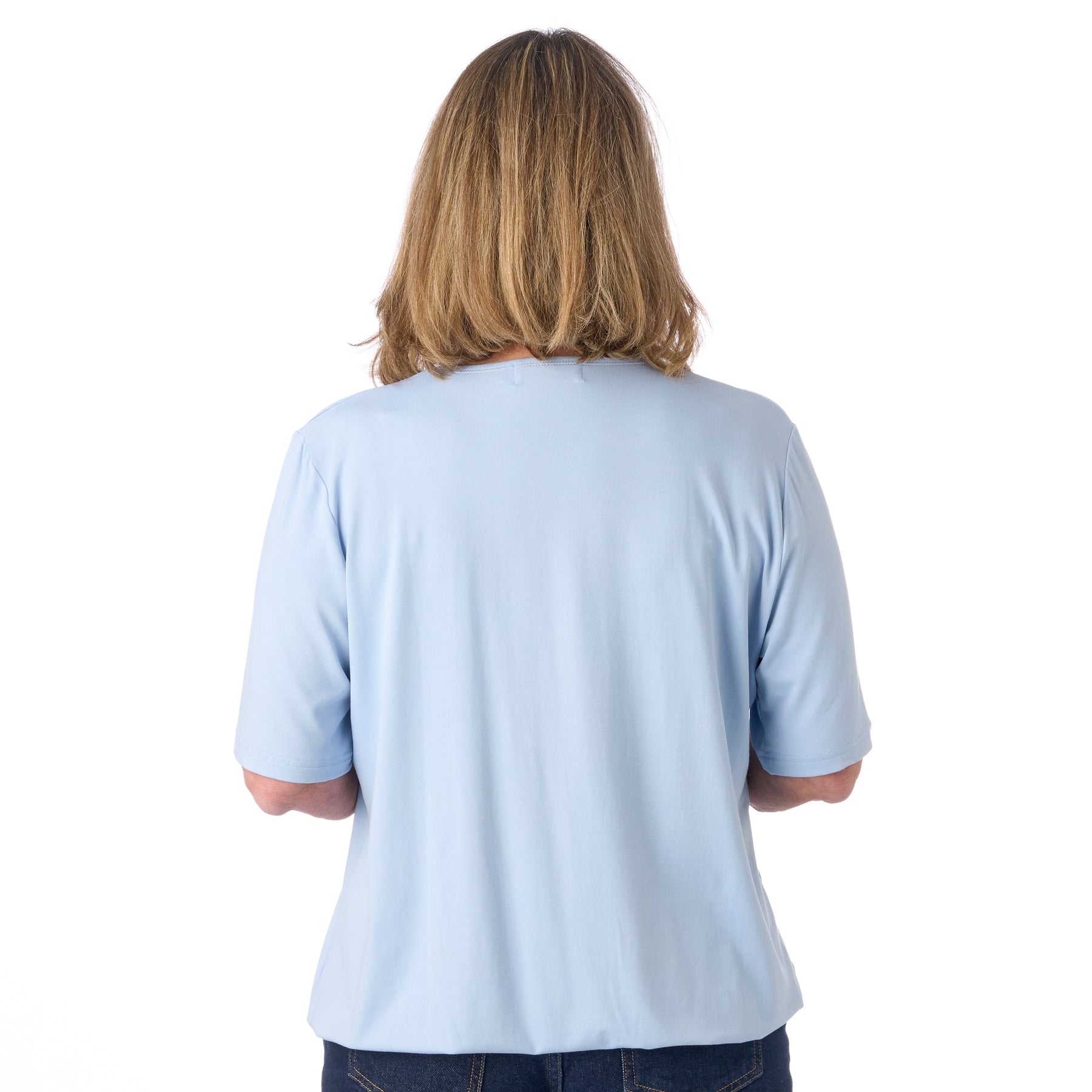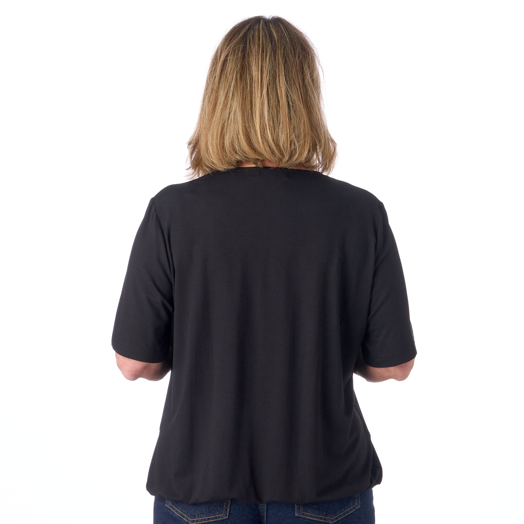Vi har medvetet designat de korta ärmarna på blusen lite längre än det man kanske är van vid. Det gör att ärmarna inte kryper upp och kommer i vägen när du tar på dig en jacka eller tröja.