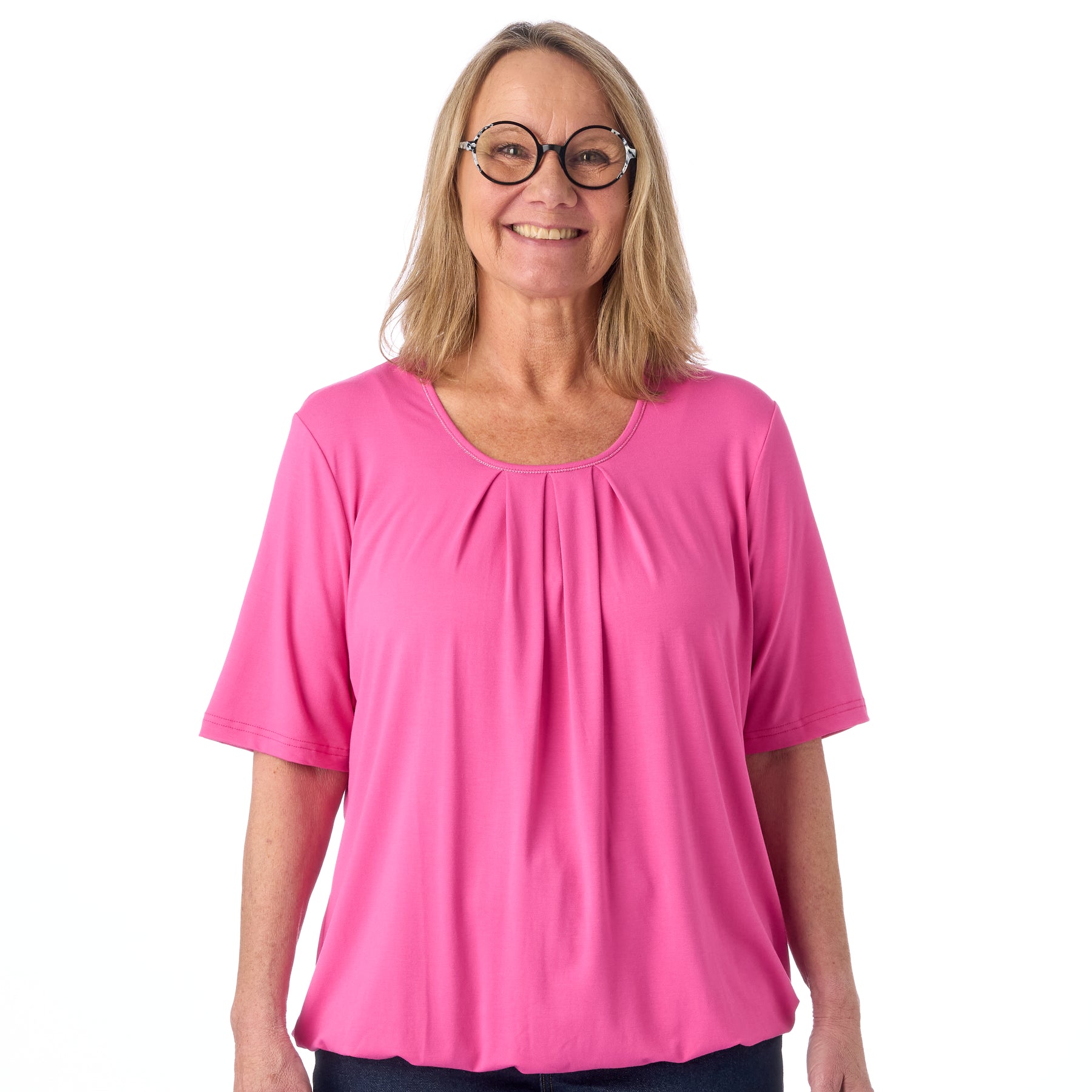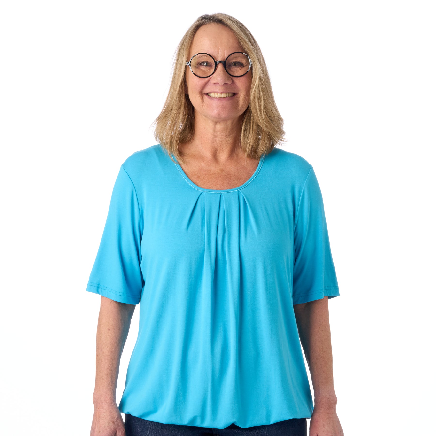 Tyngden i tyget och de tre plisseringar på bröstet gör att blusen faller fint från din byst och ner över magen. Och så gör resårkanten nederst på blusen, att du kan placera den precis där du vill ha den på höften.