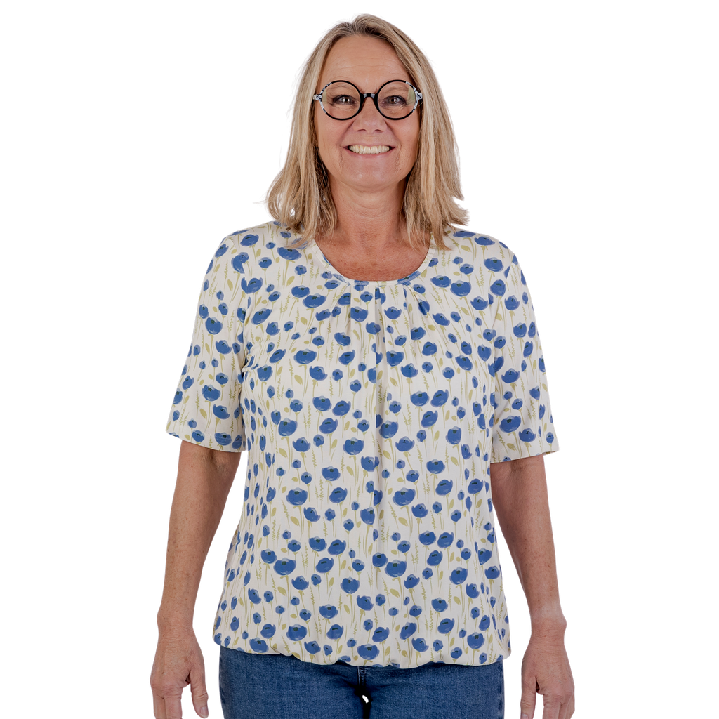 Vi har medvetet designat de korta ärmarna på blusen lite längre än det man kanske är van vid. Det gör att ärmarna inte kryper upp och kommer i vägen när du tar på dig en jacka eller tröja.