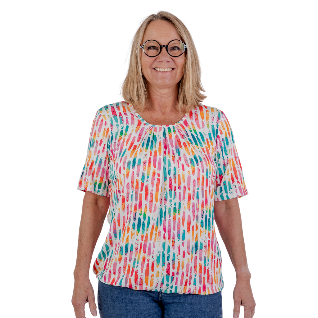 • Resårkanten nederst på blusen gör att du kan placera den precis där du vill ha den på höften. Det gör att du kan kamouflera lite av magen om du vill det, för blusen inte fastnar på magen.