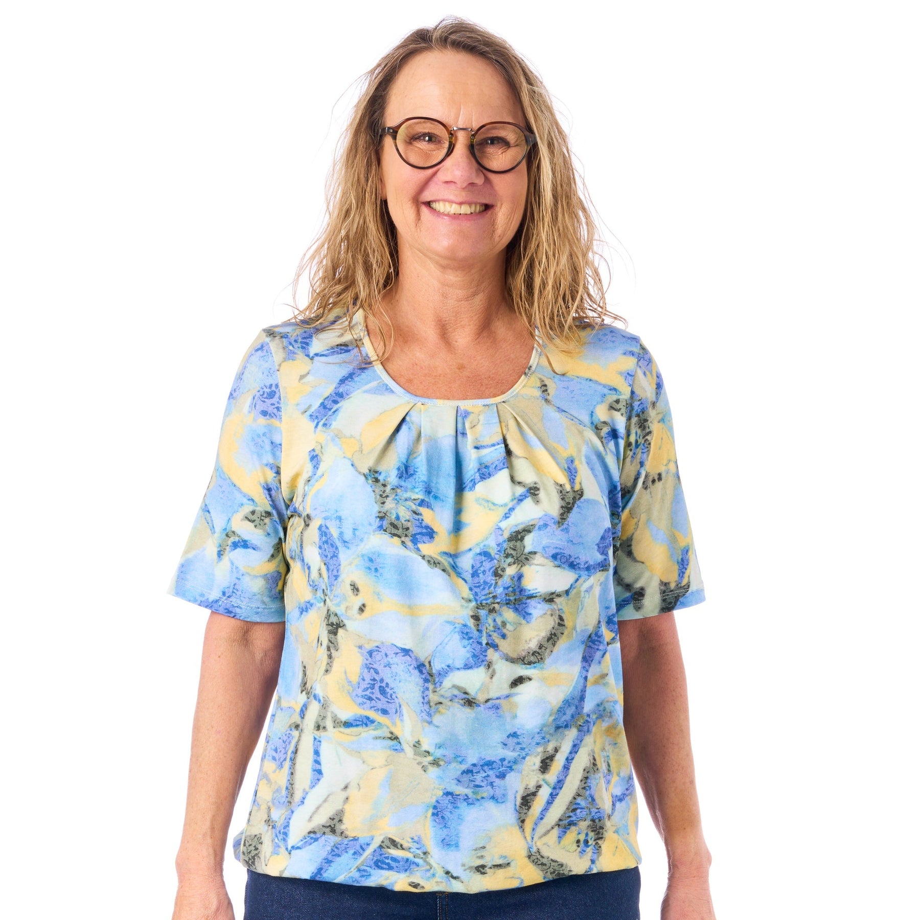 Tyngden i tyget och de tre plisseringar på bröstet gör att blusen faller fint från din byst och ner över magen. Och så gör resårkanten nederst på blusen, att du kan placera den precis där du vill ha den på höften.