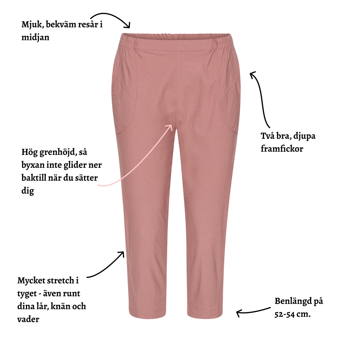 Byxorna är tillverkade i en mjuk och härlig viskoskvalitet, som är fylld med stretch. Det betyder att de följer dina rörelser, oavsett om du cyklar en tur, fixar i trädgården eller kopplar av på terrassen.