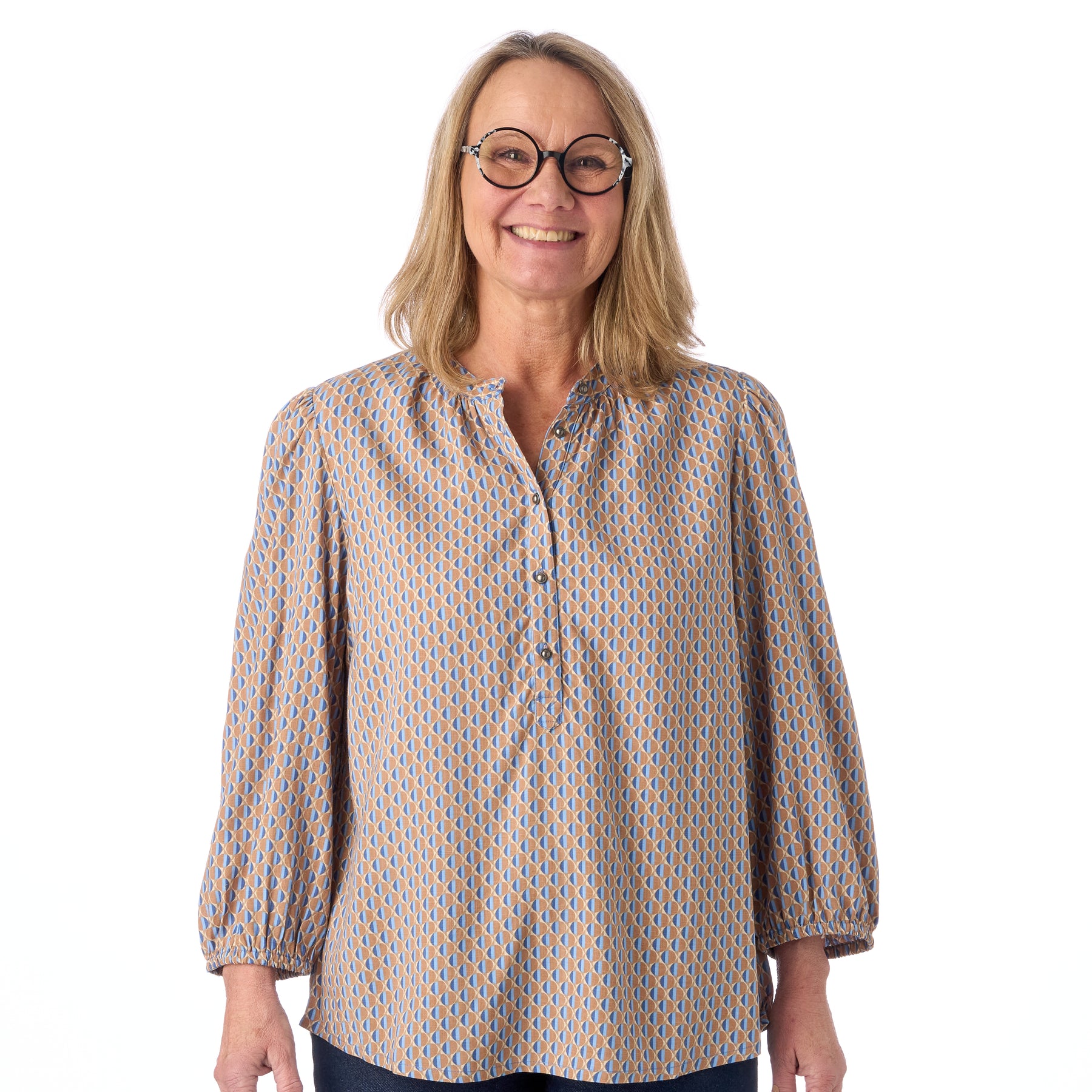 Det grafiska mönstret i bruna och beige toner med lite blått ger blusen ett varmt och modernt uttryck. Färgerna gör den lätt att matcha med både jeans och mer klassiska byxor.