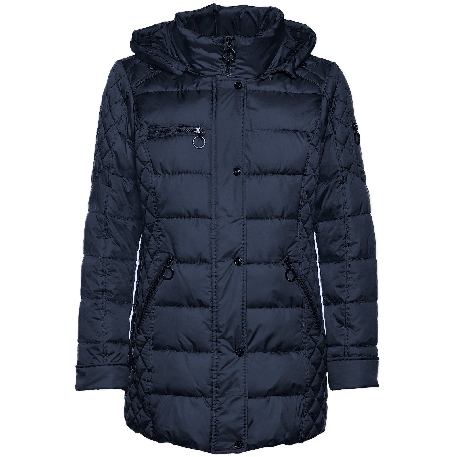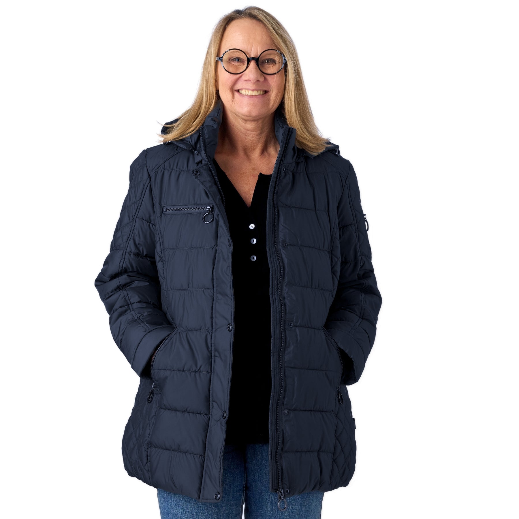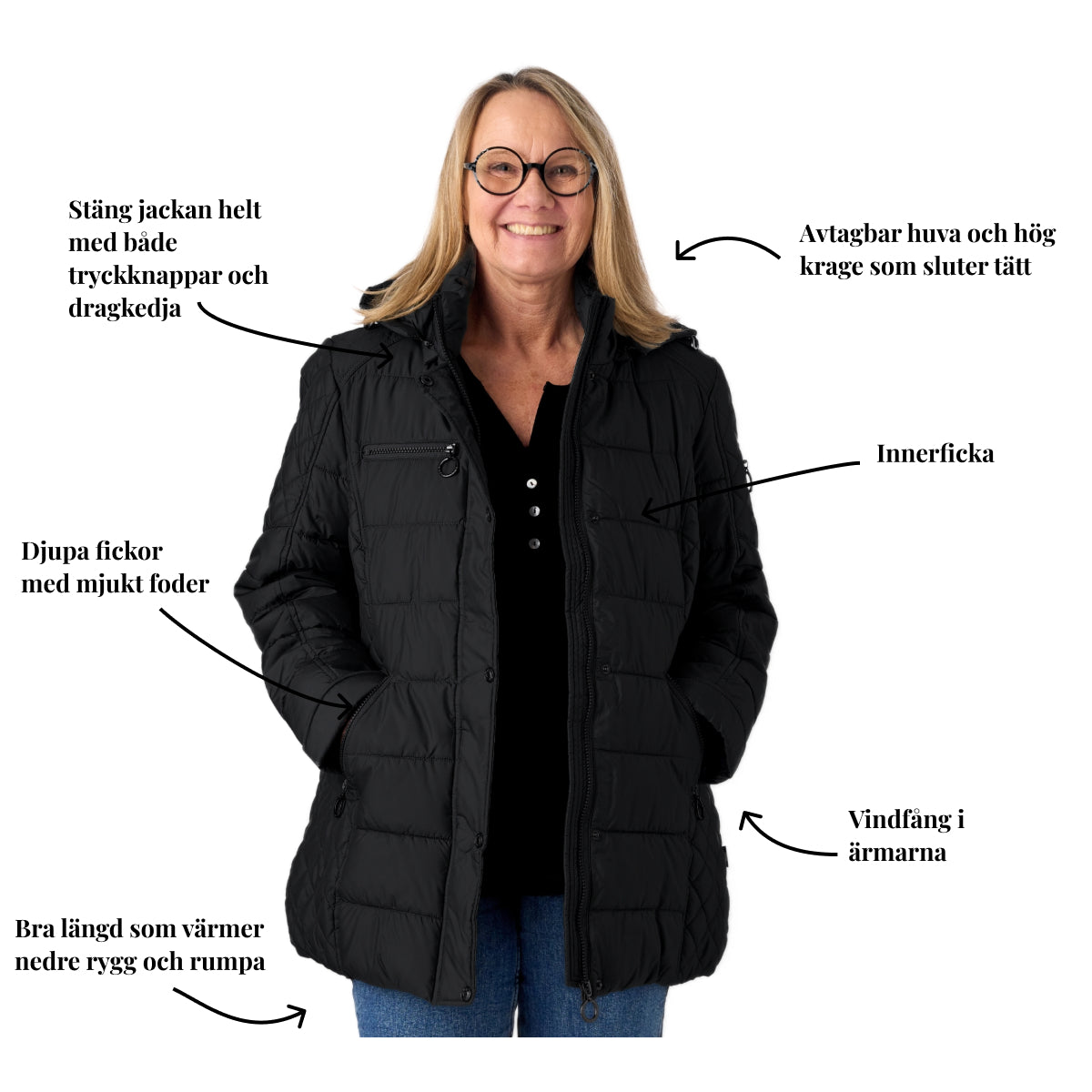 Jackan stängs med både dragkedja och knappar, så vinden inte smyger sig in. Det ger en skön känsla av att vara ordentligt inbäddad, även när vädret är ruggigt.