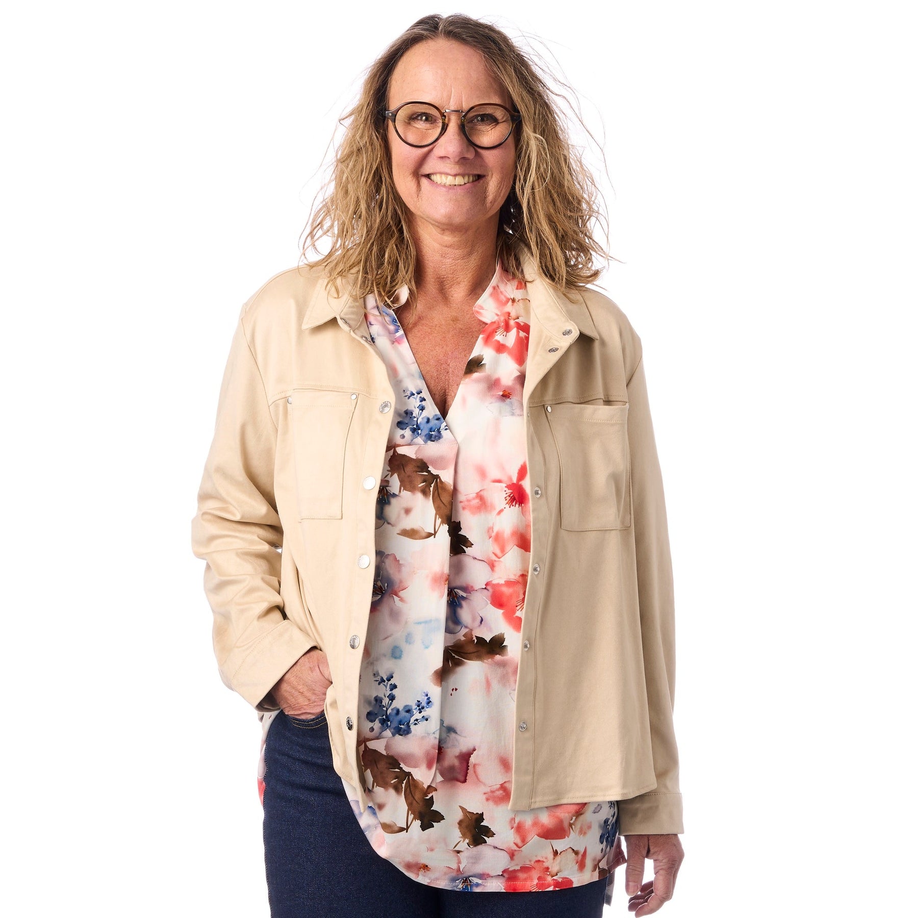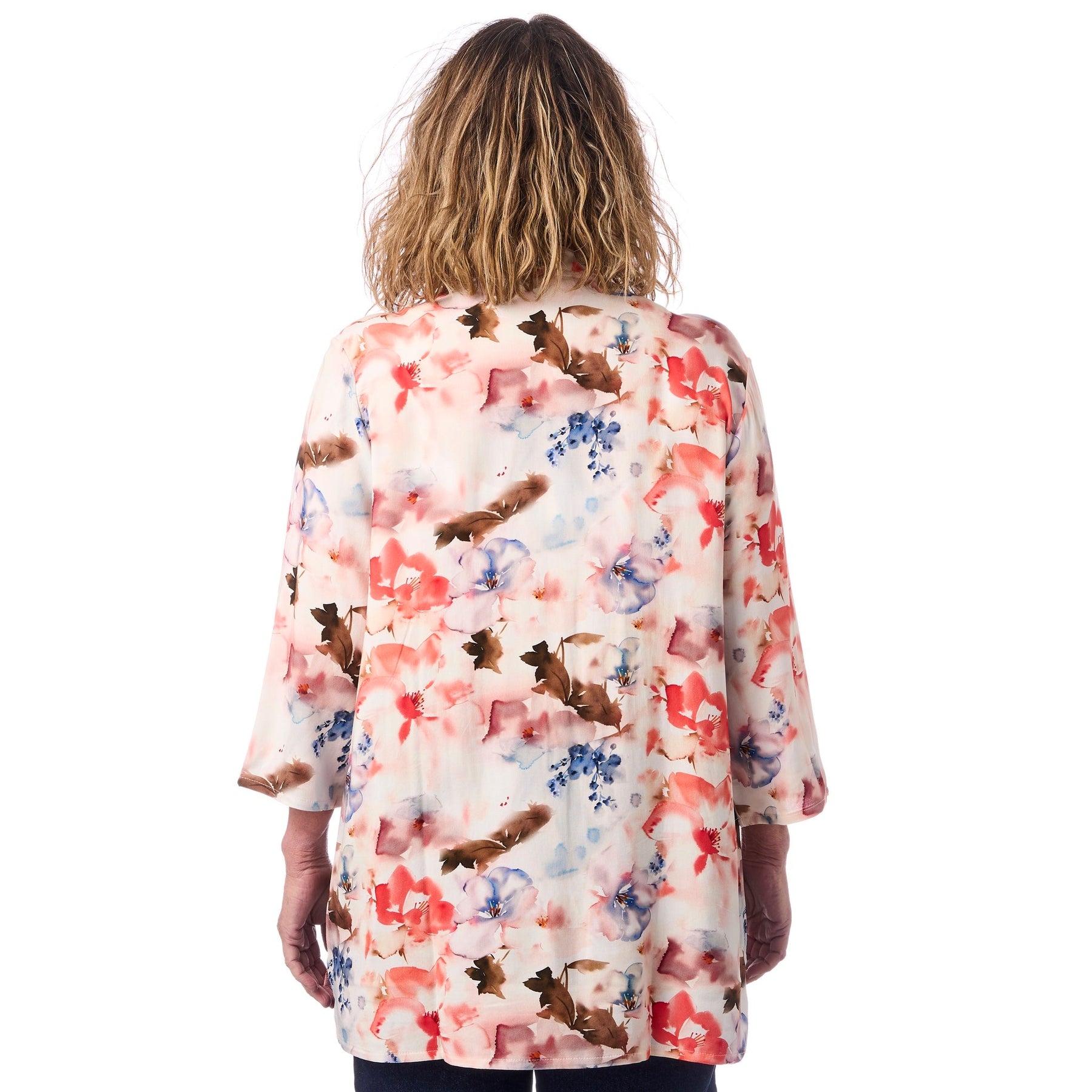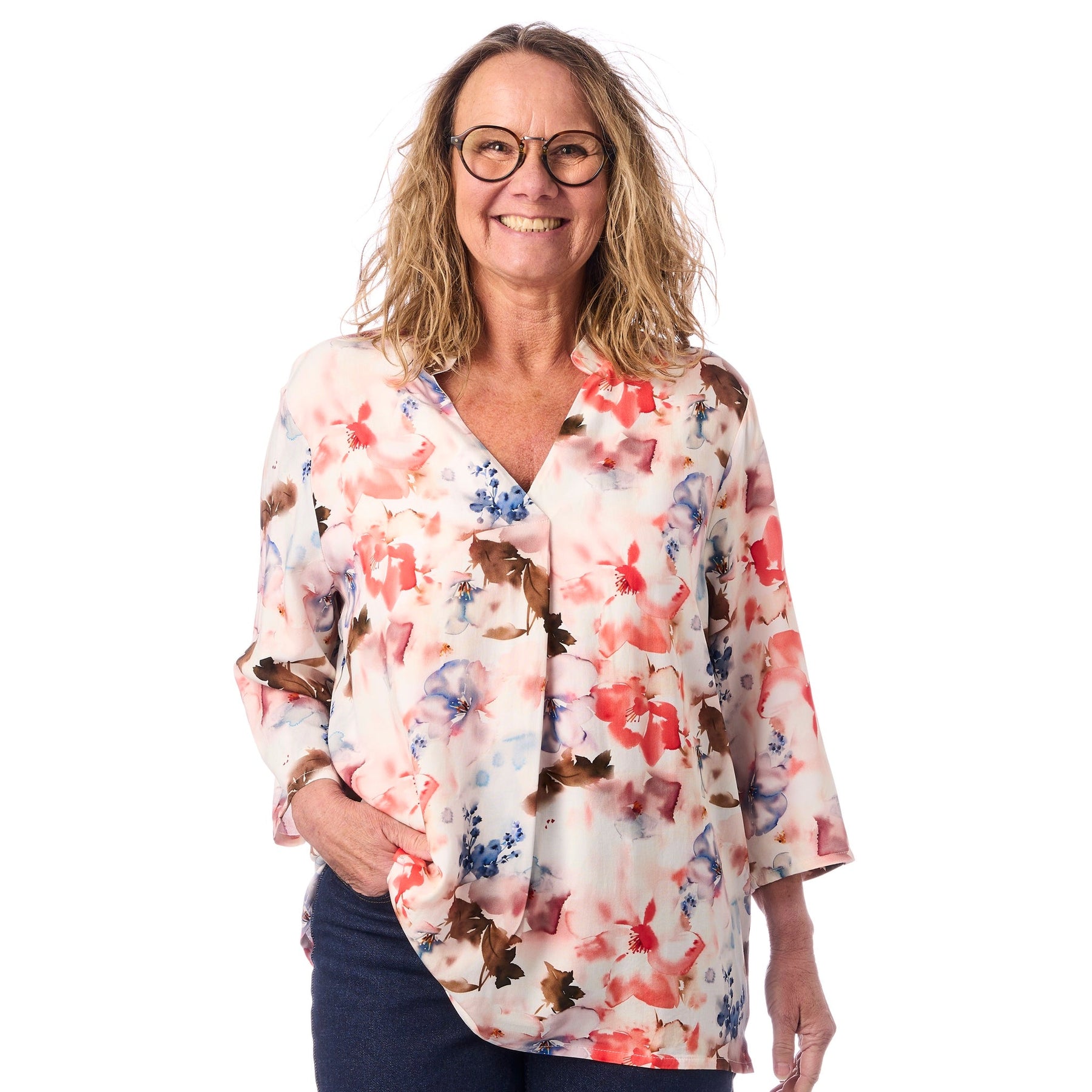 Blusen är prydd med ett mjukt, drömmande akvarelltryck av stora blommor i korallröd, lavendel och olivgrön på en ljus botten. Trycket har en konstnärlig, handmålad kvalitet som ger blusen ett exklusivt och unikt uttryck. Det är den sortens tryck som får folk att fråga var du har köpt den.